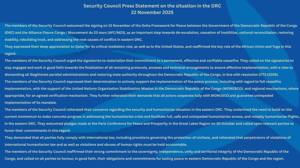 Το Συμβούλιο Ασφαλείας του ΟΗΕ εξέδωσε Δήλωση προς τον Τύπο σχετικά με πρόσφατες εξελίξεις που αφορούν την κατάσταση στη Λαϊκή Δημοκρατία του Κονγκό.
